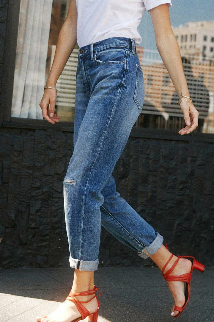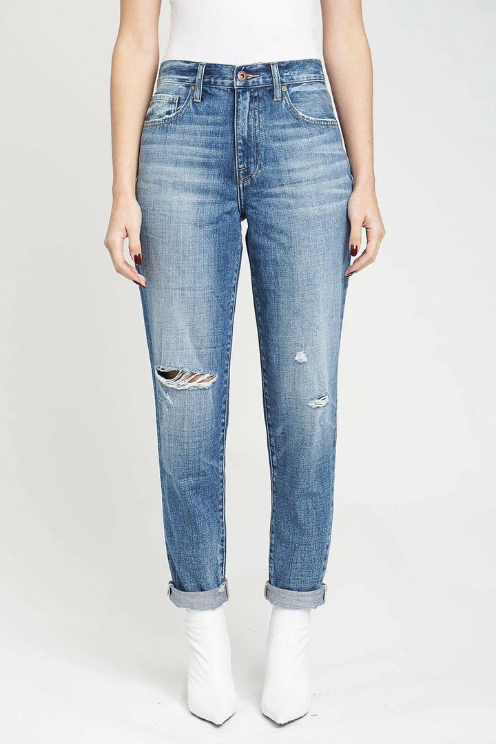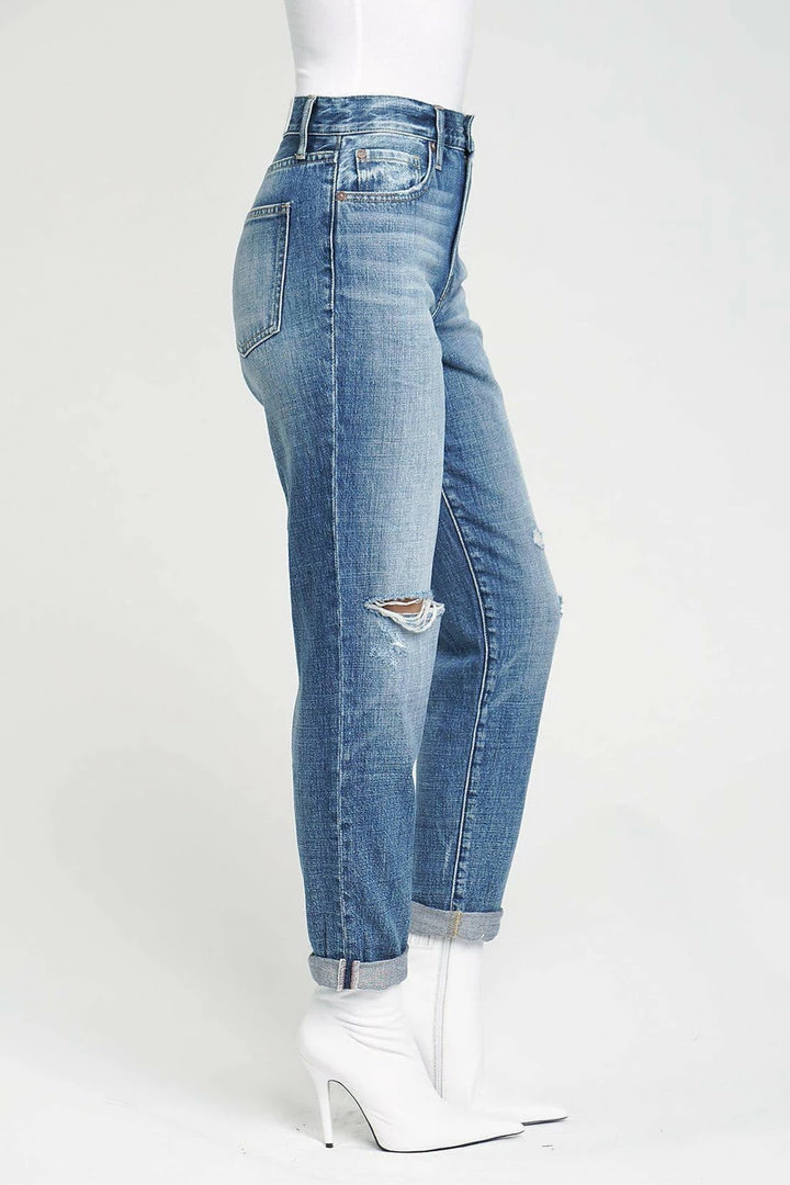 The Presley is a high rise vintage ’90s roller jean. This style in the City of Angels wash features one knee ripped destruction.