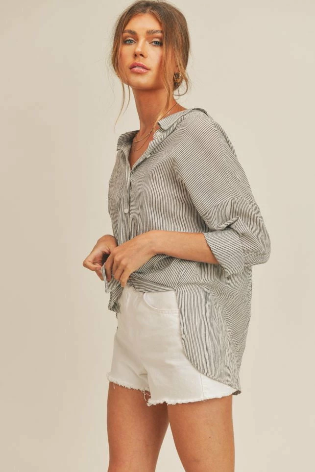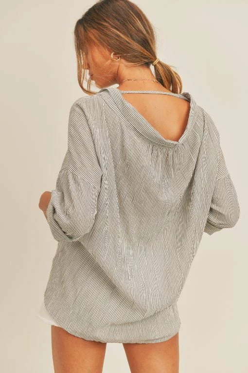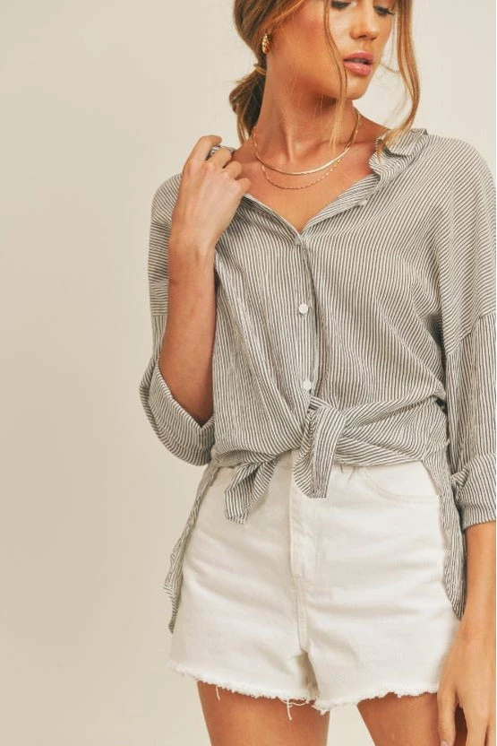 Stay cool in our Breeze Linen Shirt in Grey. An essential for everyone’s wardrobe. Button Up, Tie Front, Open Back Detail.