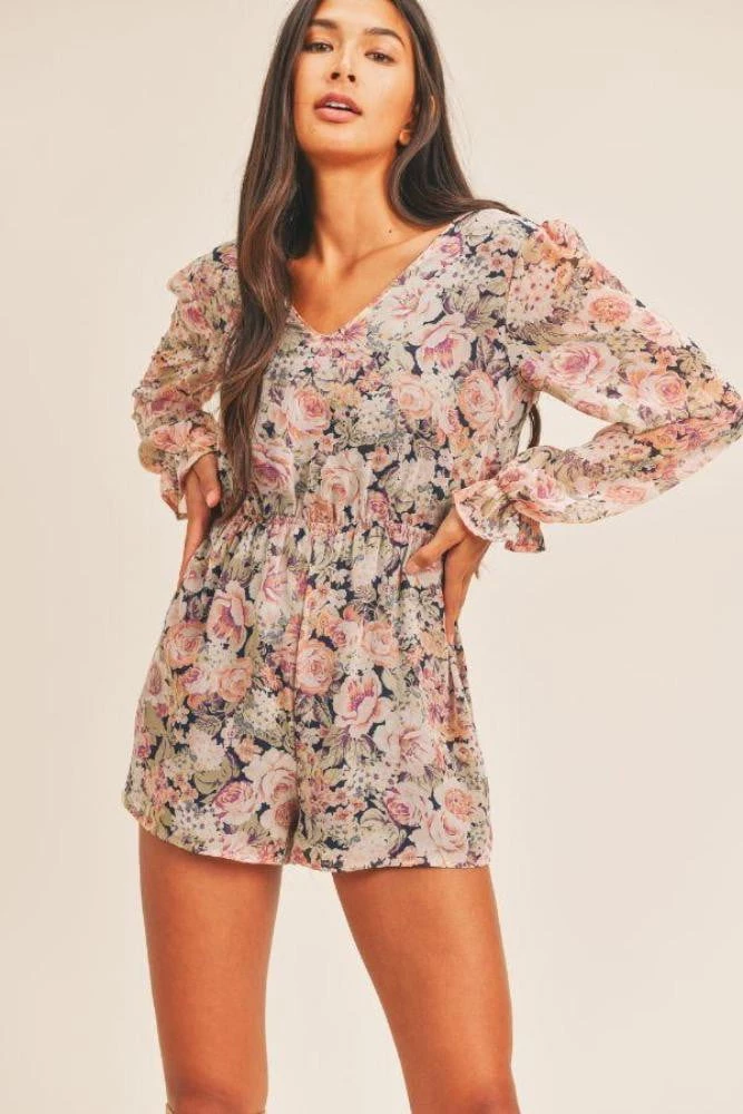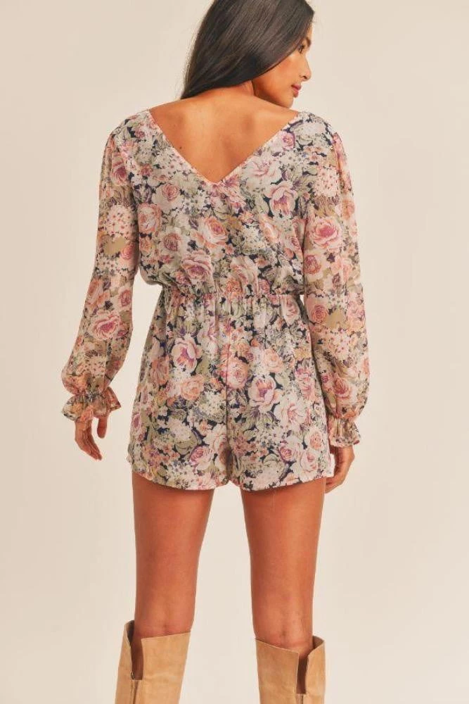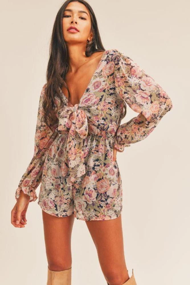 Floral dreams come true. The Isabella Romper pairs perfectly with knee high boots. Featuring ruffle sleeves and a tie-front.