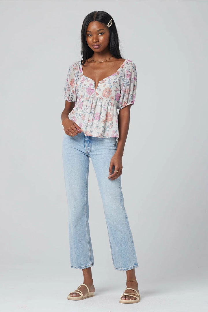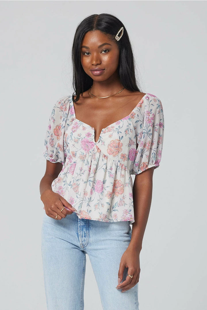 The off-white top will sure pop with the beautiful array of light florals!