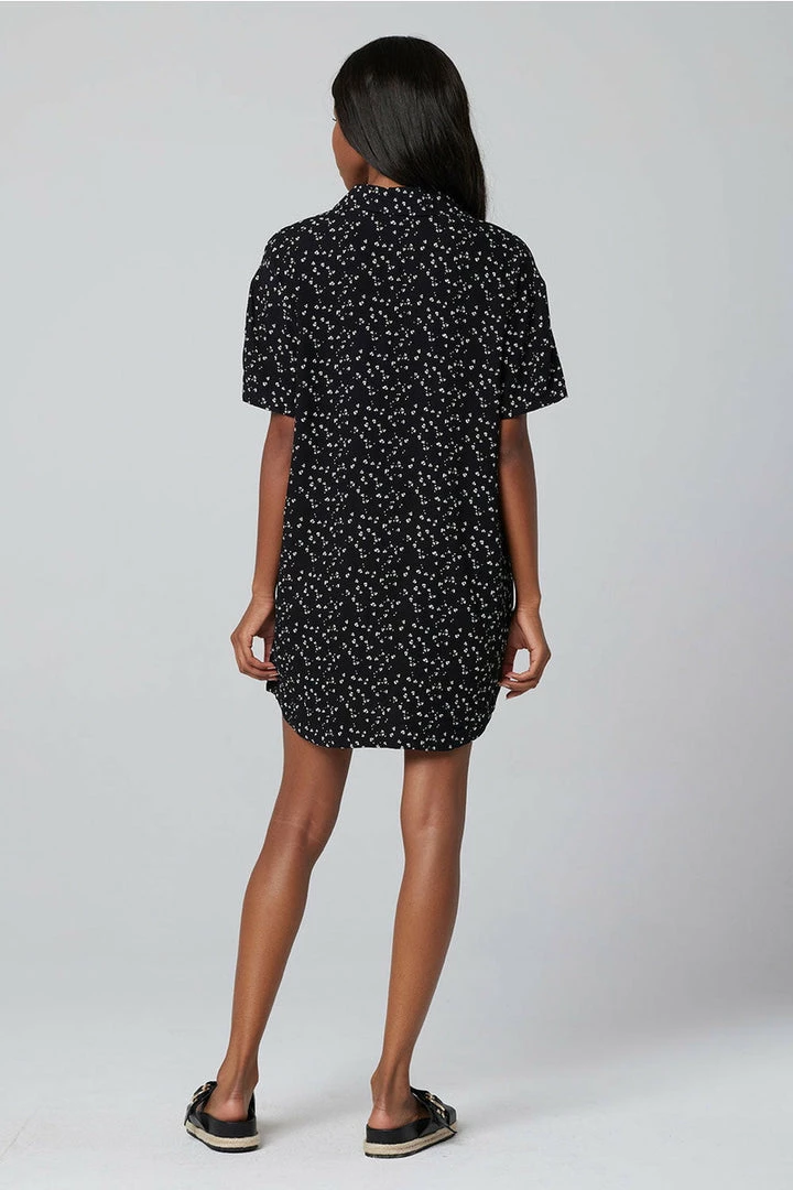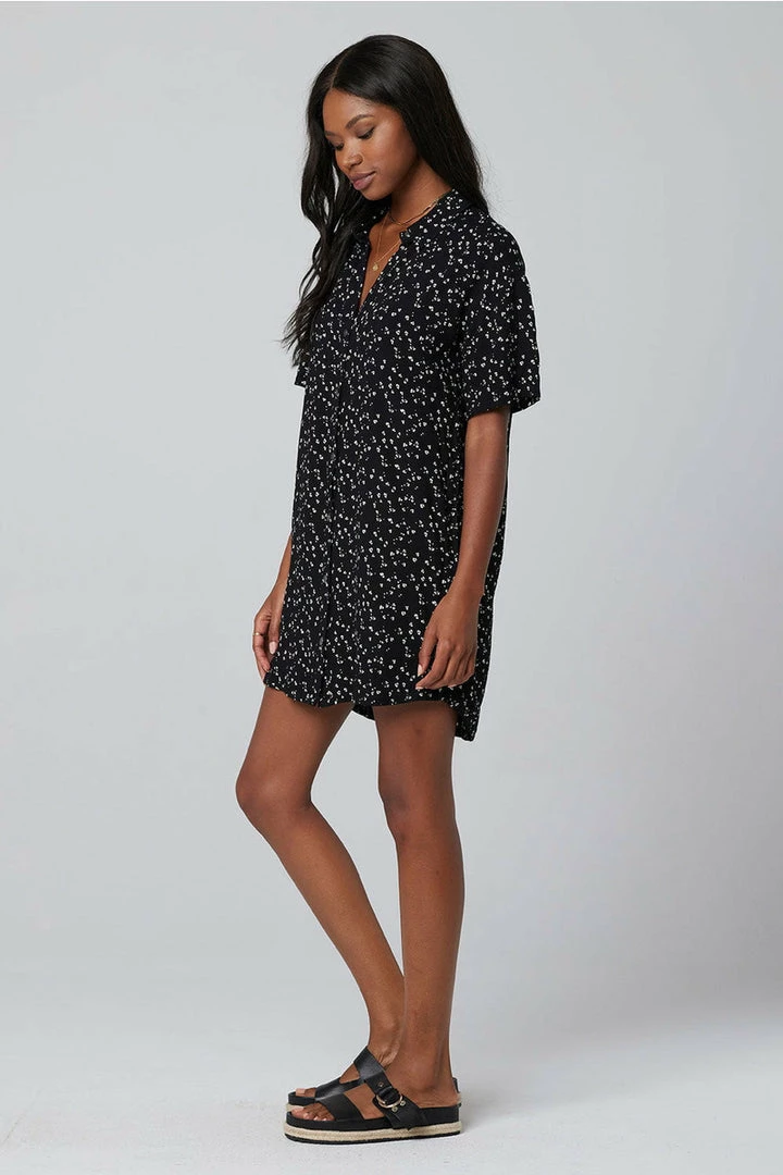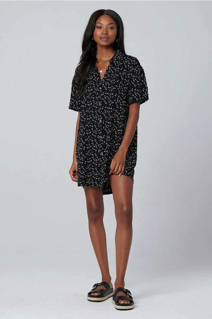 100% Eco Rayon Sage Mini Dress features short sleeves, a deep V-neck and flowy lay.