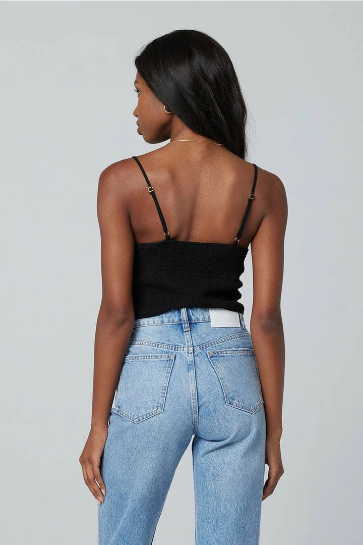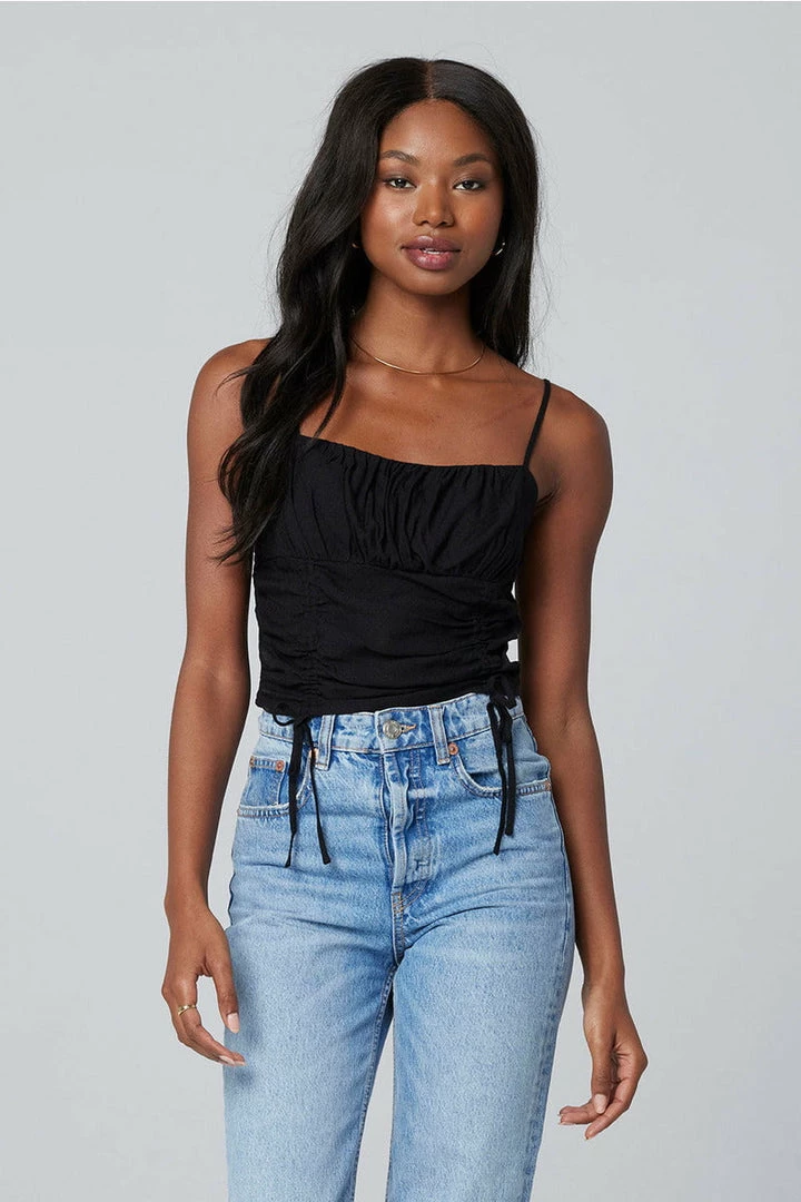 The 100% Rayon Serena Slim Tank features spaghetti straps, a form fit and ruching details throughout.