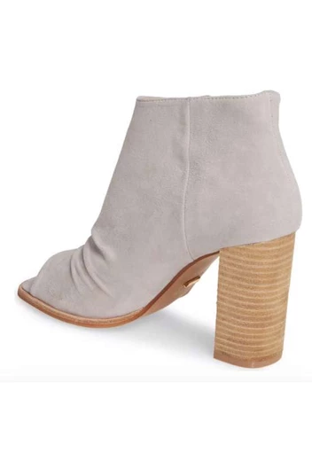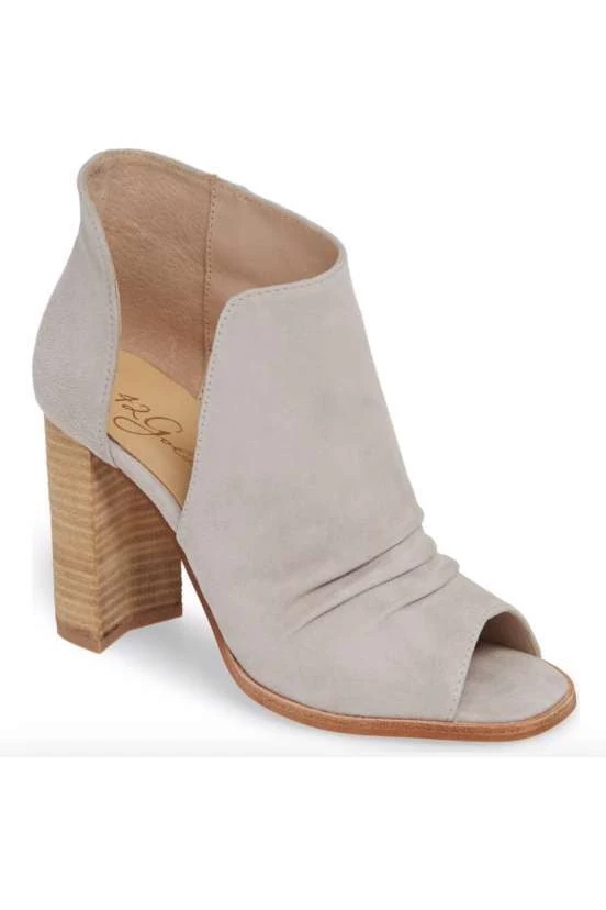 Heeled ankle boots with a leather upper and cutout side panel. Open-toe silhouette, pull on wear.