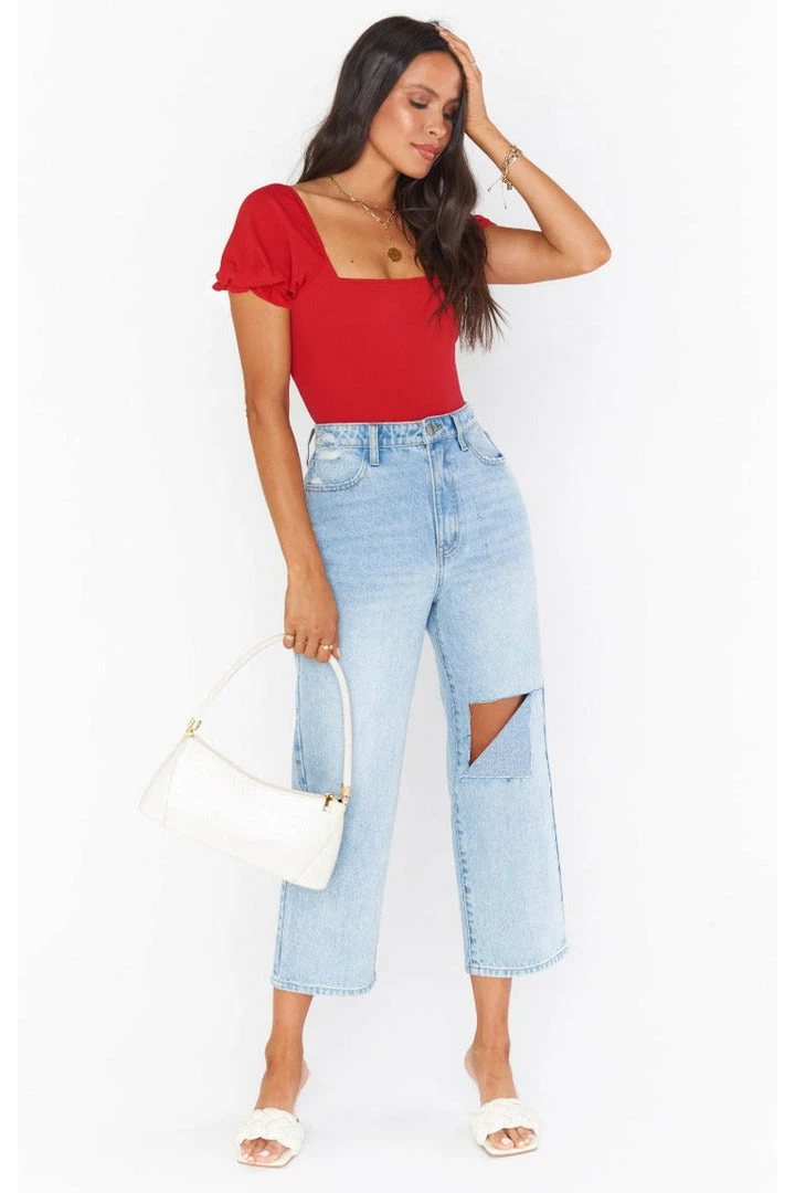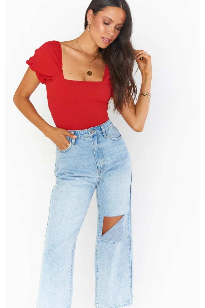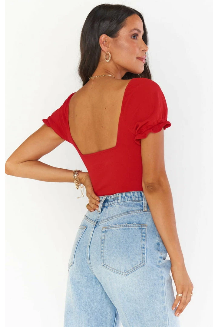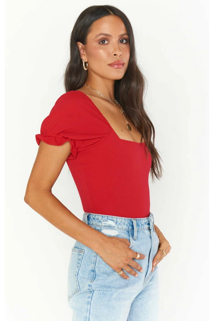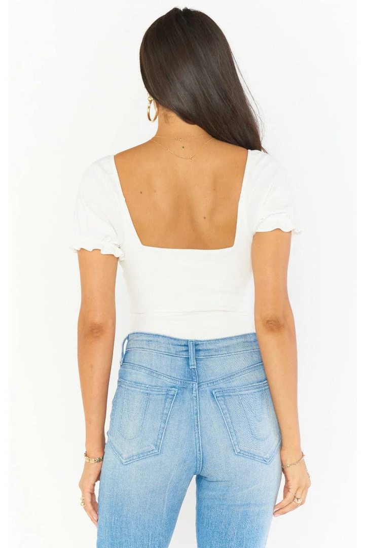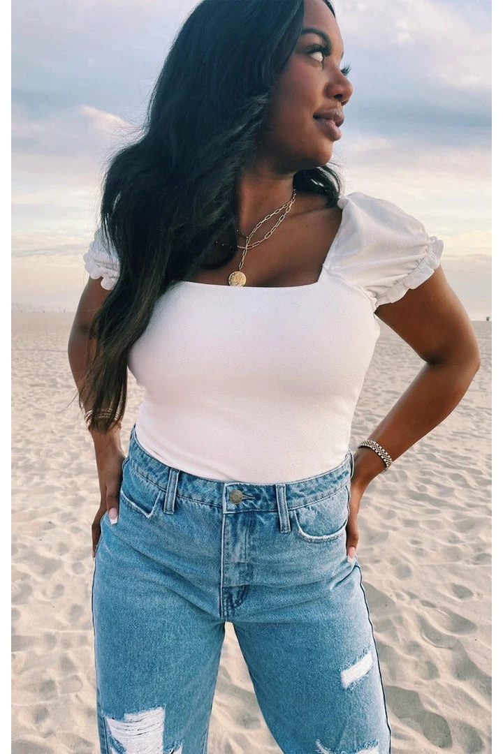 The closet staple white bodysuit you need in your life! The puff sleeves and square neck make this the perfect crossover of sensible and stylish. Our stretch material is thick enough to give you coverage and hold you in in all the right places.