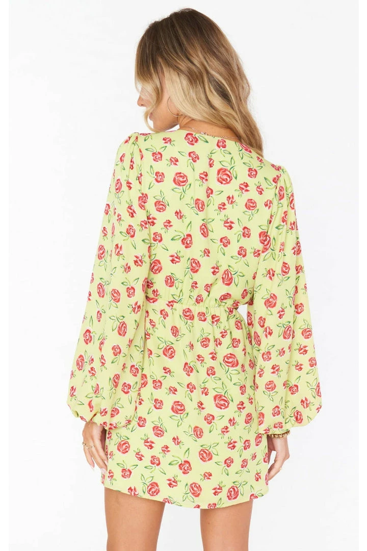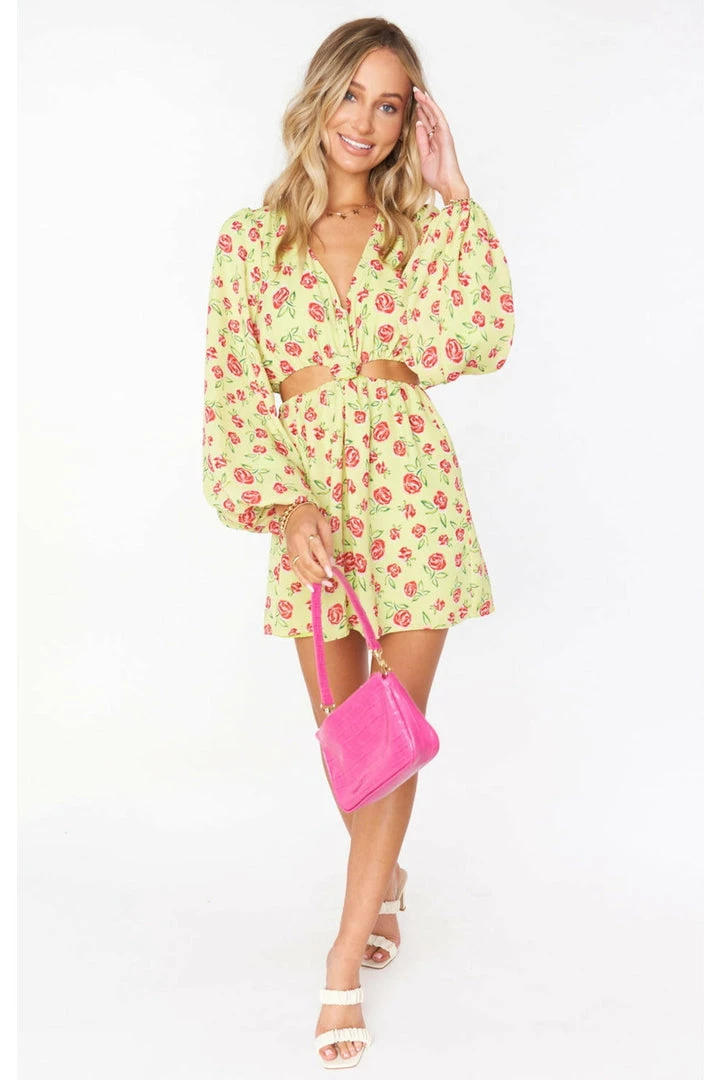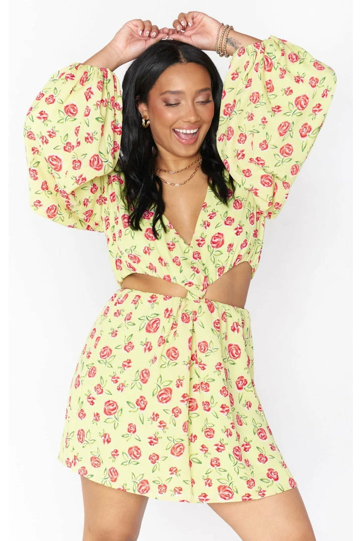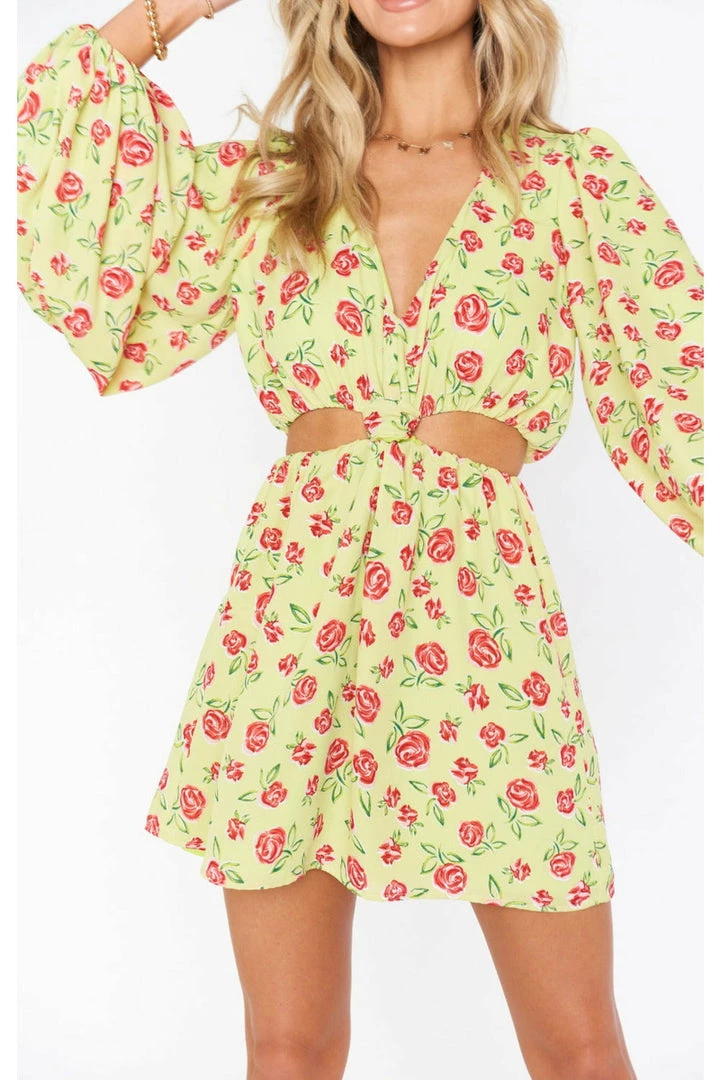 Flirty and floral, this yellow and red flower print mini cut out dress is the number your closet is missing! Long draped sleeves lead to side cut outs with a playful knot to keep it all together. Dress this up for this seasons occasions or throw on boots for a femme floral look!