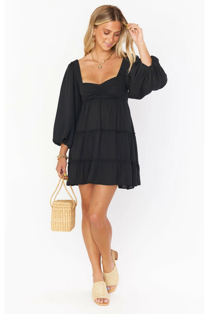 The perfect balance of boho and fun, this black mini dress will be your favorite number for all this year’s events. Sweet details with a poof sleeve and fits to perfection with a smocked back. Met with a comfortable flowy skirt, you’re going to love this new mini.