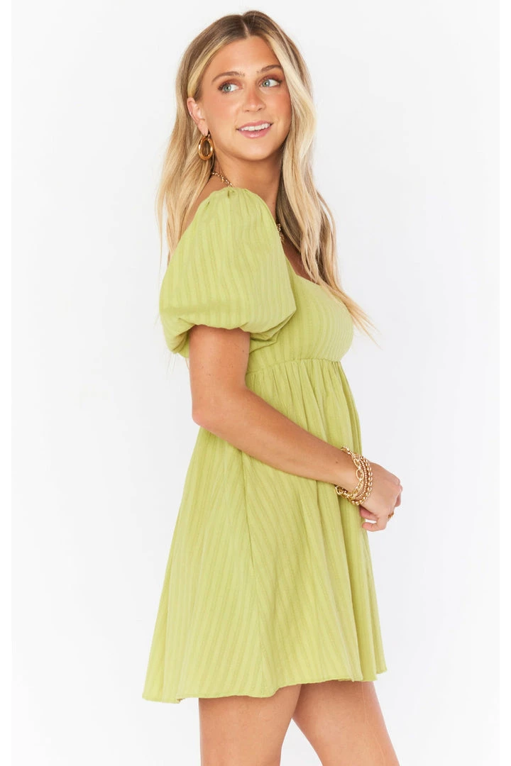 You will be just smitten in this pear green babydoll dress! A cool square neckline next to perfectly poofed sleeves are perfectly contrasted to flatter a range of bust sizes and the elastic smocking in the back allows for a perfect fit!