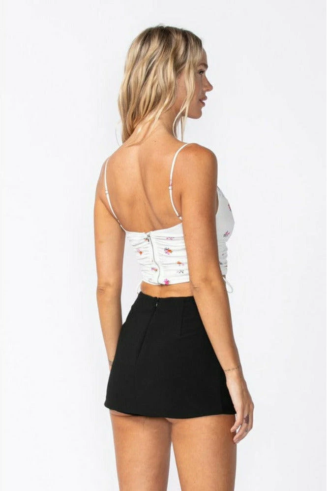 This Sky To Moon Floral Bra Button-down crop top with side ruching.