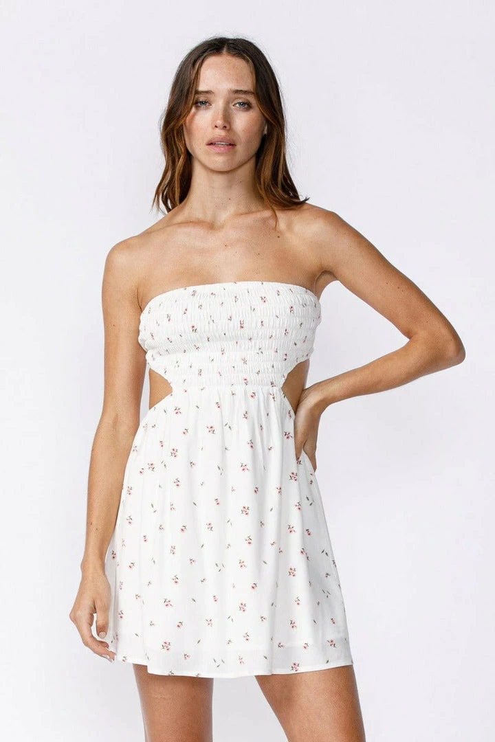This Sky To Moon Floral Print Tube dress, has side cutouts and adjustable tie back.