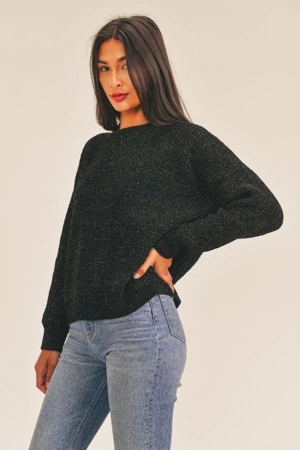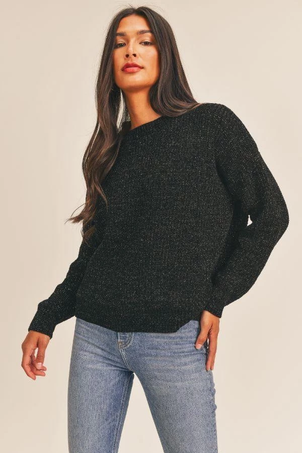 Get ready for the Holidays with this sweater from Sage the Label. Features an open twist back and gold lurex woven throughout.