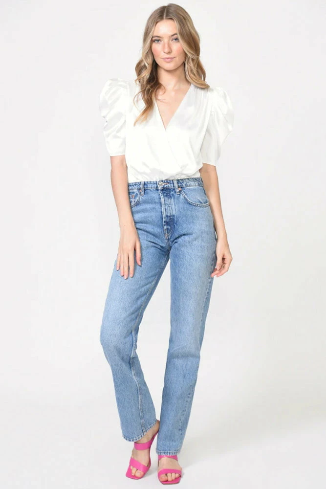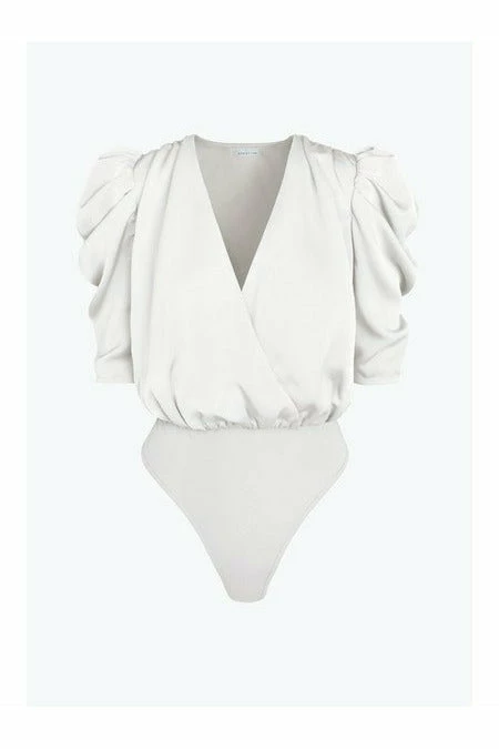 Volume takes center stage with Lila Sateen Puff Sleeve Bodysuit. Short puff sleeves bring a touch of drama to this elegant sateen bodysuit look that is decorated with ruched detailing. Snap button closure.