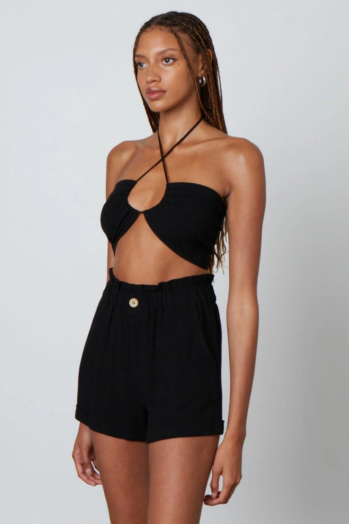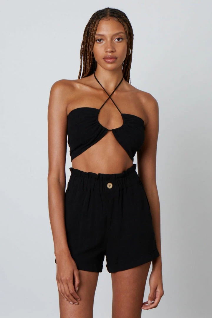 This linen blend halter bralette top features a smocked back and adjustable tie halter . Pairs perfectly with Cotton Candy Linen Cuff Elastic Waist Short.