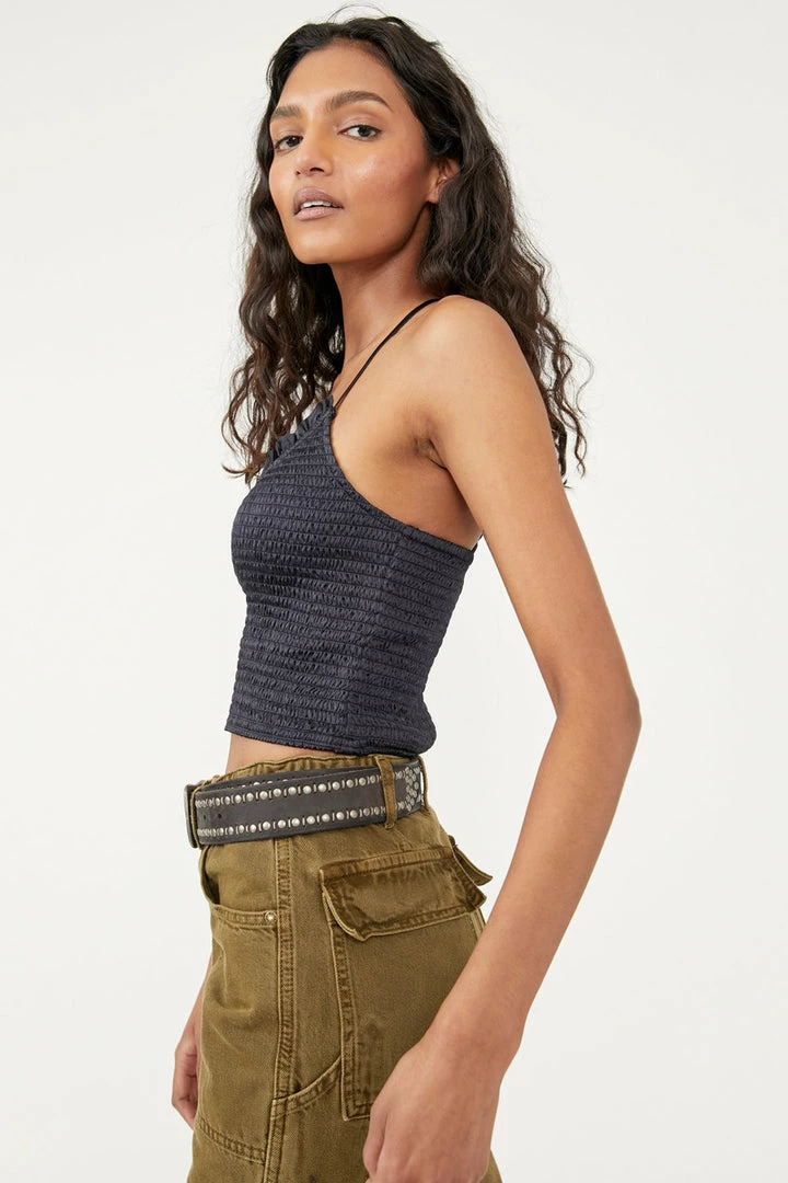 Sweet and smocked, this essential cami features a scoop neckline with ruffle neckline, slim silhouette, and adjustable racerback straps for added support.