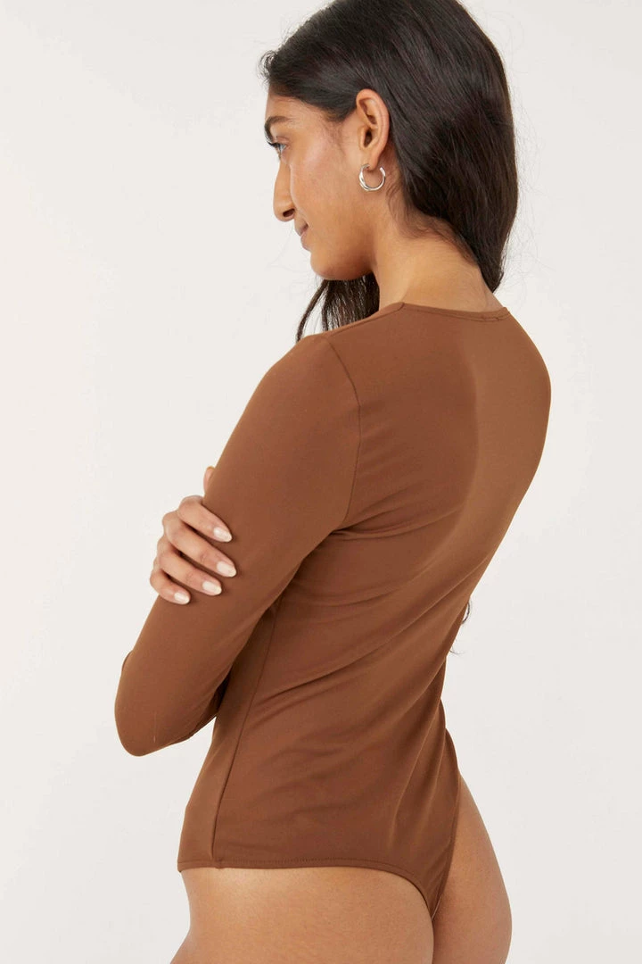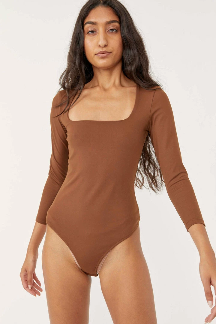 American made formfitting bodysuit featuring a sleek square neck and three-quarter sleeves.