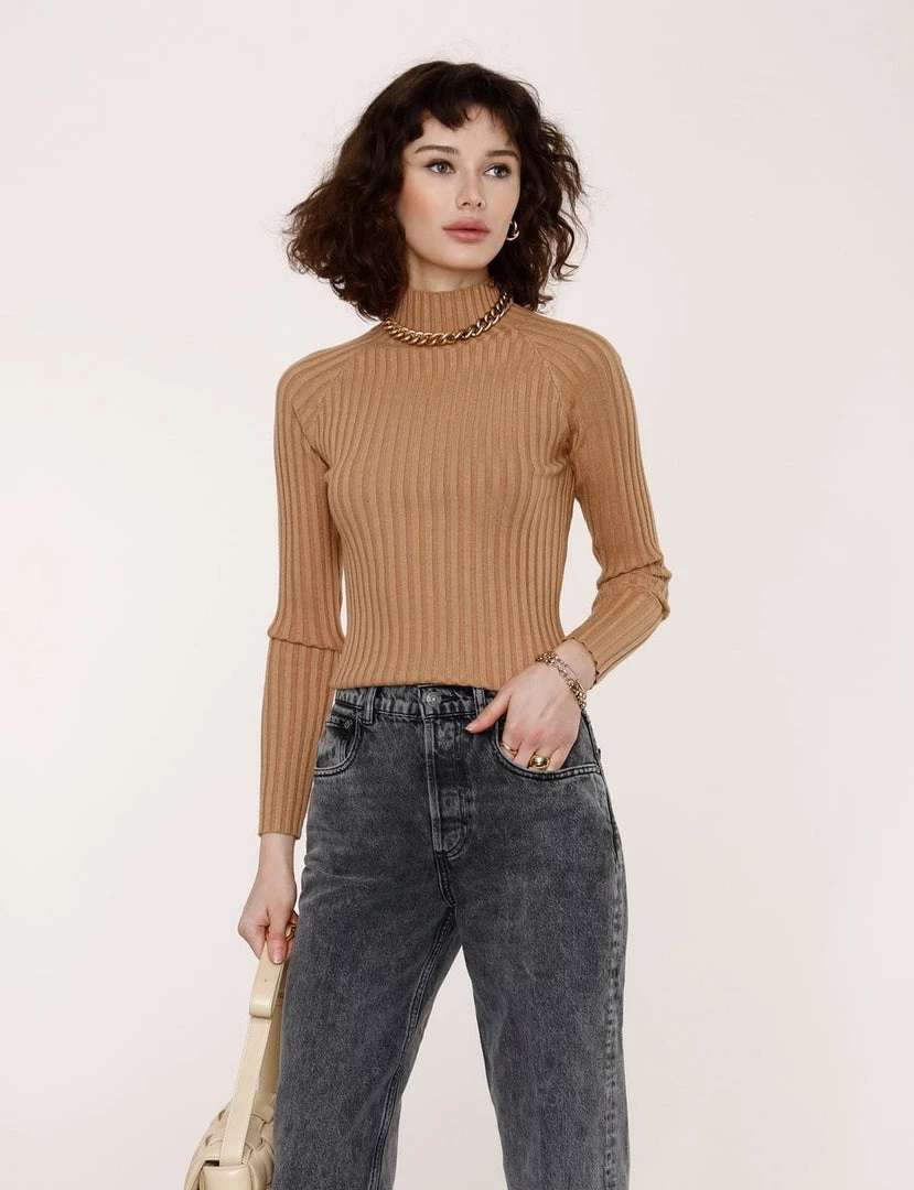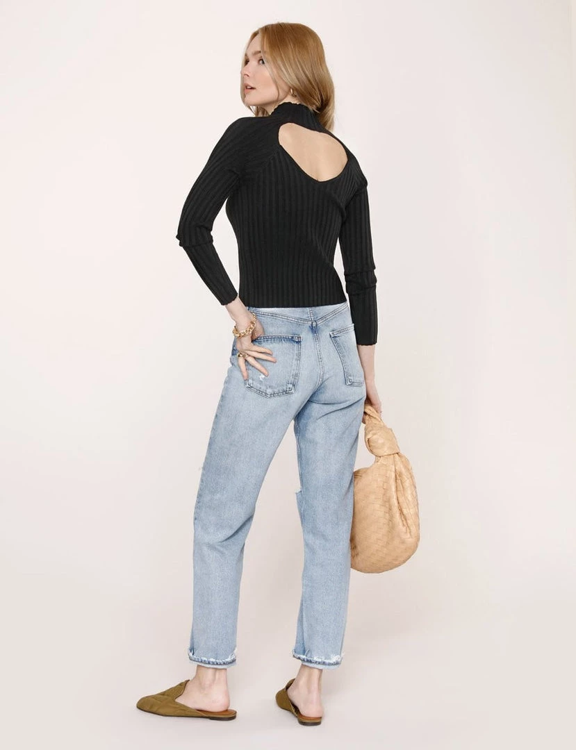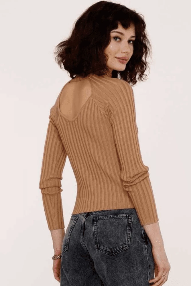 The Alida Sweater is knitted from a textured rib and features a standing collar. Push your hair to the side to show off the sexy but subtle window in the back