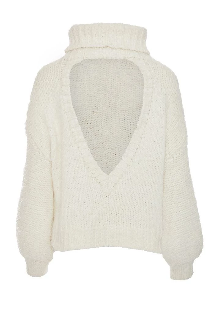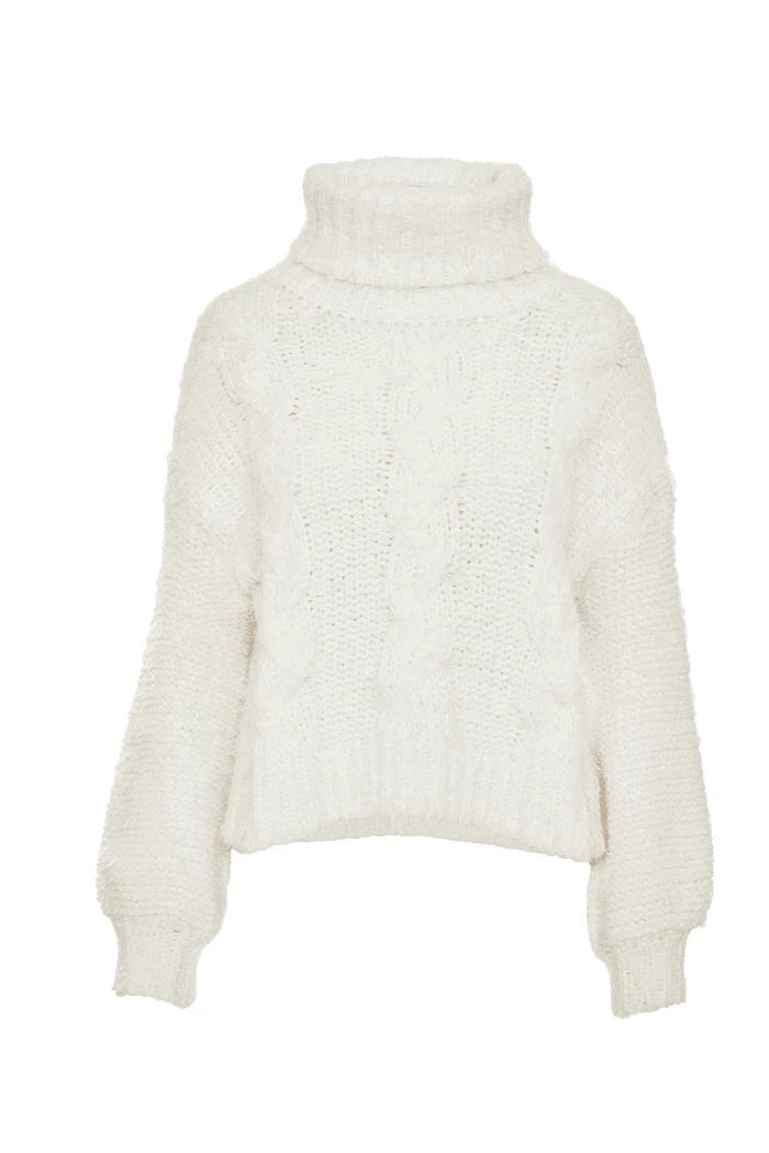 Soft and fuzzy cable knit shapes this snuggly sweater that has a slouchy turtleneck and long balloon sleeves with drop shoulders and fitted cuffs. The relaxed bodice ends at a slightly cropped, notched hem. Cutout at the back adds an unexpected but chic finishing touch!