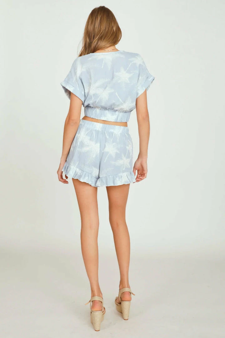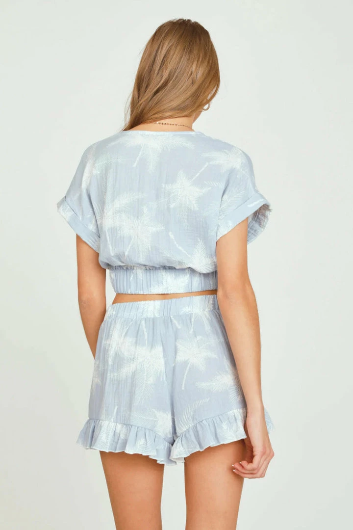 The Blue w/ White Palm Trees Printed Gauze Twist Front Top features short sleeves, twist front and a blue palm print pattern.
