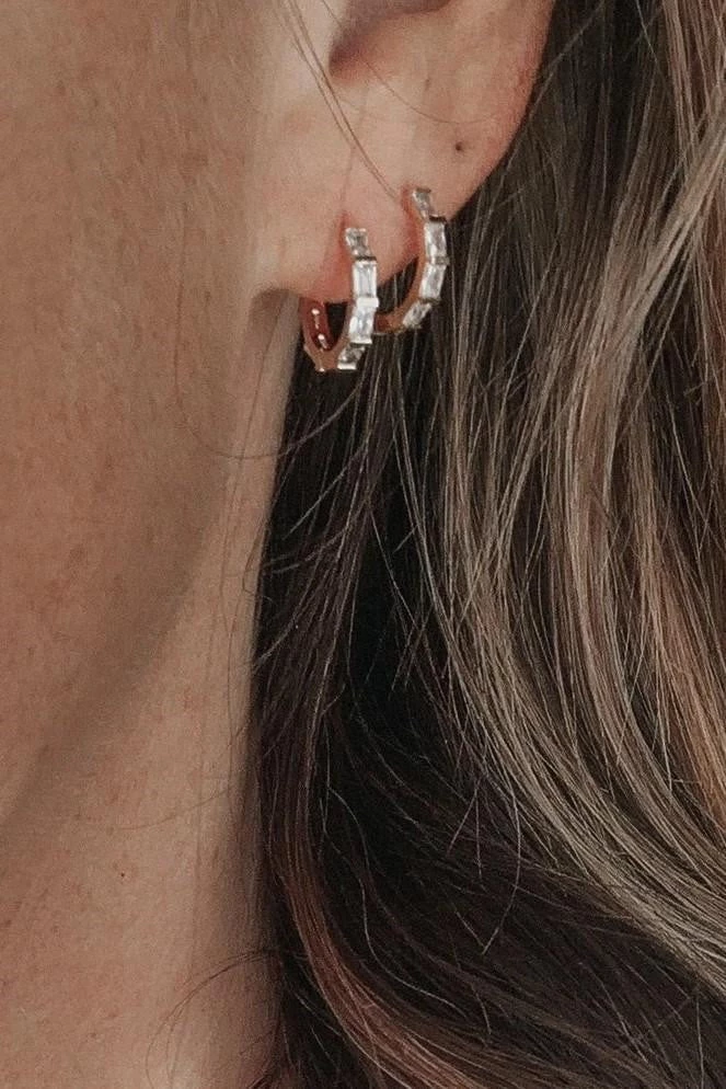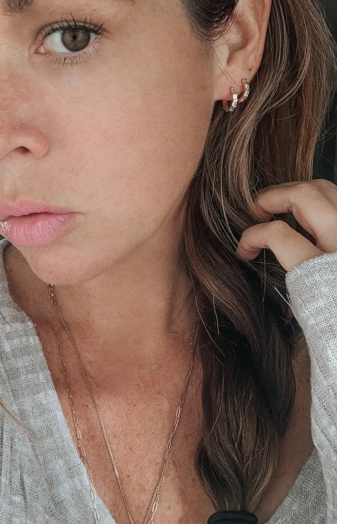 Our Isla Hoops are your new favorite tiny hoops! They are so sparkly and unique. They’re minimalist + chic, and look great adorned with other earrings if you have multiple piercings!