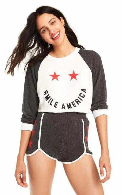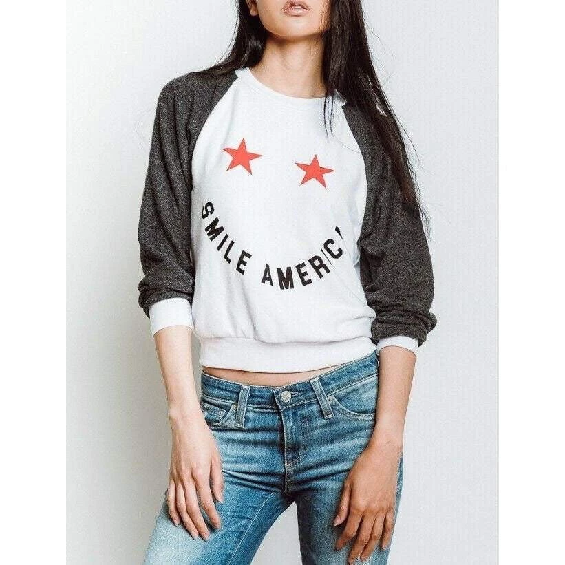 Super soft sweatshirt with “Smile America” in the shape of a smiley face.