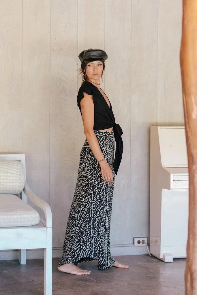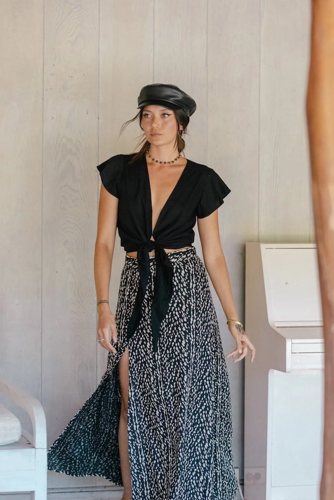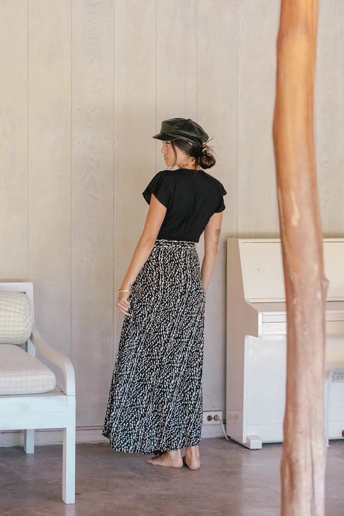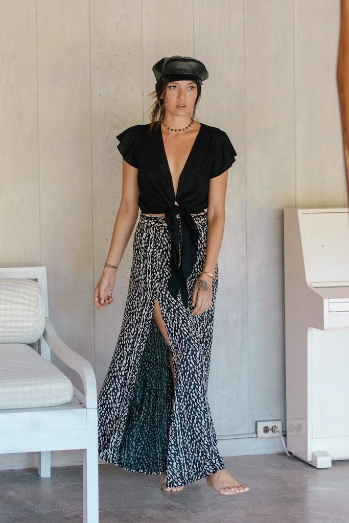 Even if you aren’t at a resort you’ll feel like you are when you slip into this piece. Features a hidden side zip and high slit to show off your stems.